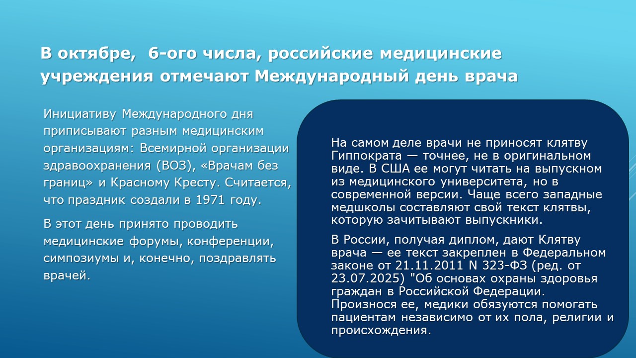 Здоровьесбережение. Виртуальная выставка книг к Международному дню врача 6 октябряУважаемые подписчики и гости нашего сайта!Здоровье-это универсальная ценность человека, столь же важная как счастье и благополучие. Здоровьесбережение имеет особое значение в жизни каждого; это ключевой аспект национальной безопасности, оно определяет возможности достижения индивидуального и общественного благосостояния и благополучия. На протяжении всего календарного года существует множество медицинских дат и праздников. Одной из таких значимых дат в 2025 году является 6 октября – Международный день врача (праздник отмечают в первый понедельник октября). Он учреждён по инициативе Всемирной организации здравоохранения, Международной медицинской гуманитарной организации «Врачи без границ» и «Красного креста». В этот день пациенты всего мира выражают благодарность своим врачам, также специалистов поздравляют близкие, чествуют коллеги и официальные лица страны. Мы благодарим врачей за их важный неоценимый труд и желаем успехов в работе, энергии и удачи! Приглашаем посмотреть небольшую выставку литературы в помощь врачам. Надеемся, что представленная информация будет вам полезна.